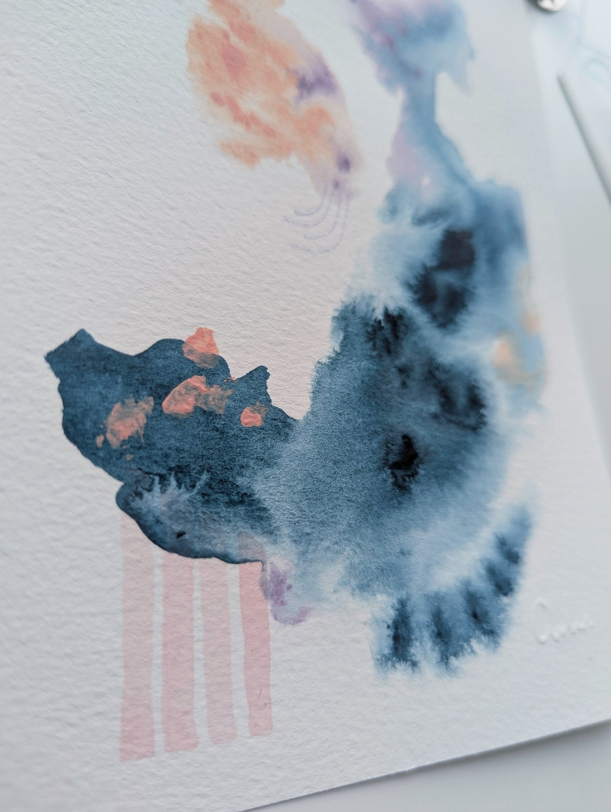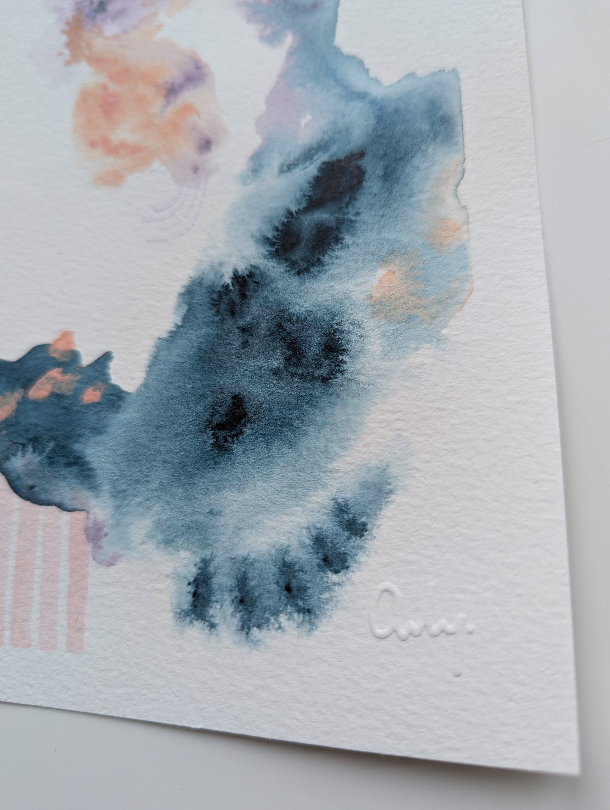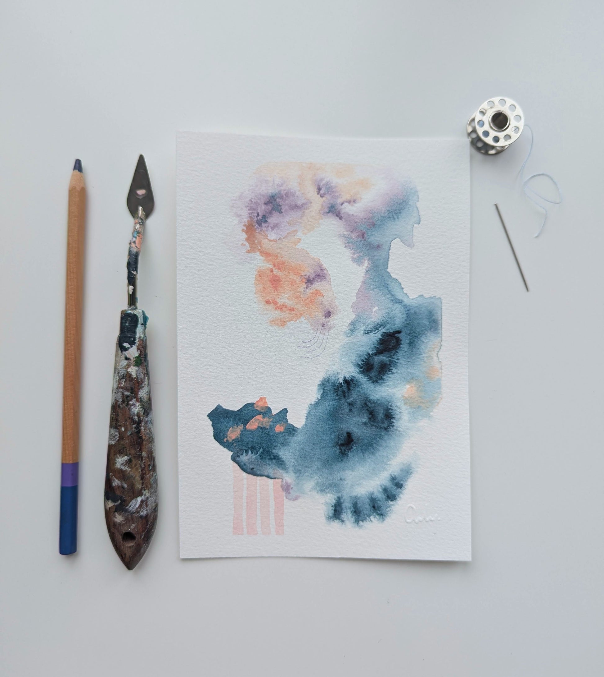 Médium: Peinture, crayon, broderie sur papier 300 mg/m2 pressé à froid (c.-à-d., un papier cartonné de qualité avec une légère texture). Signature par embossage sur papier.