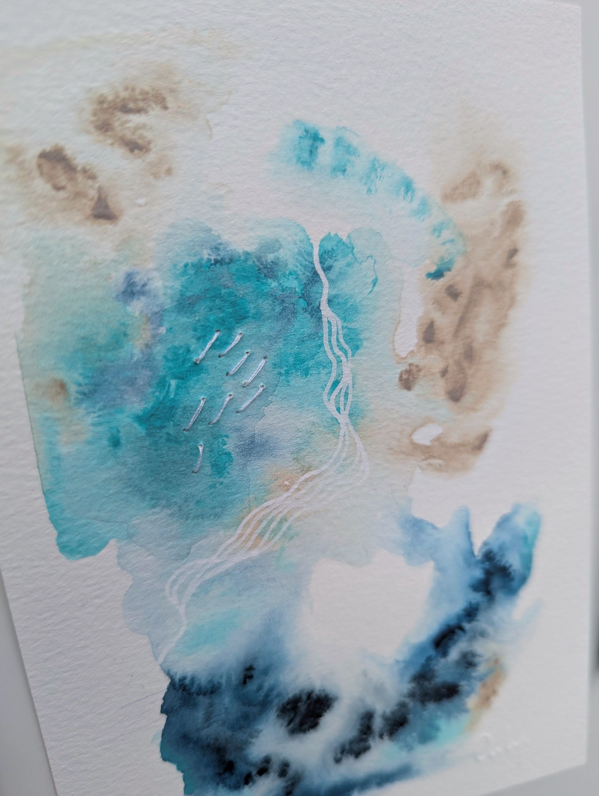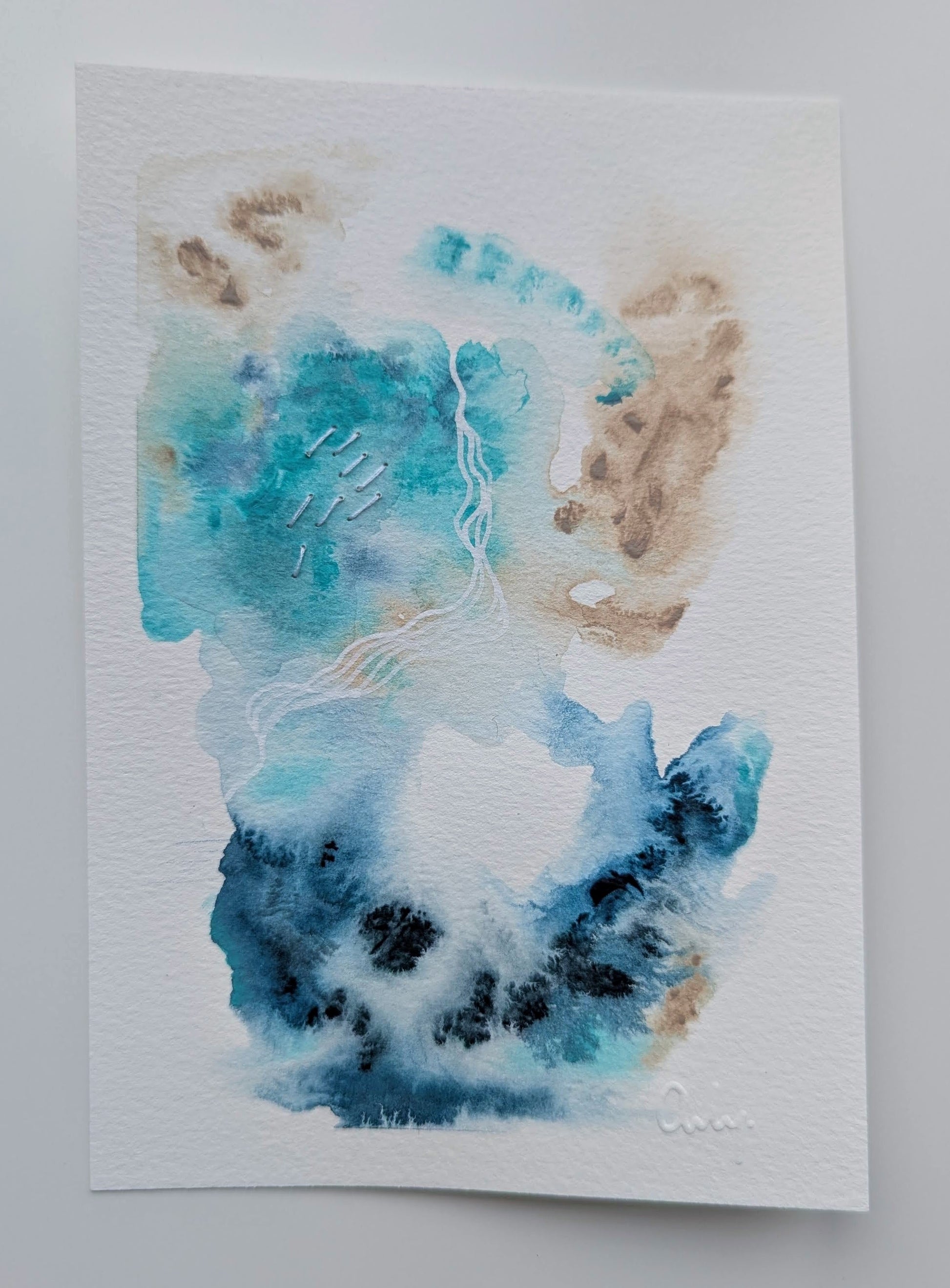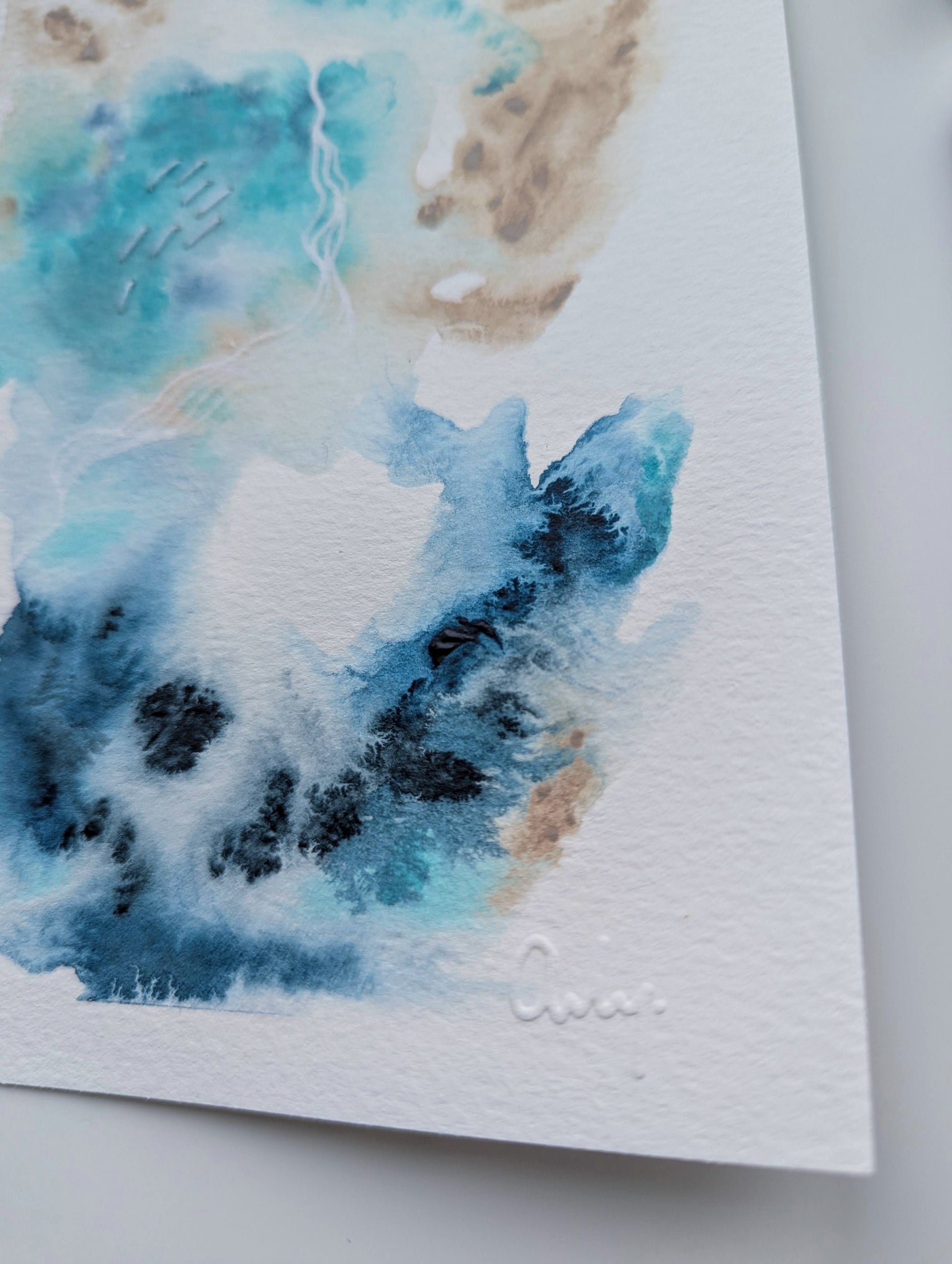 Médium: Peinture, crayon, broderie sur papier 300 mg/m2 pressé à froid (c.-à-d., un papier cartonné de qualité avec une légère texture). Signature par embossage sur papier.