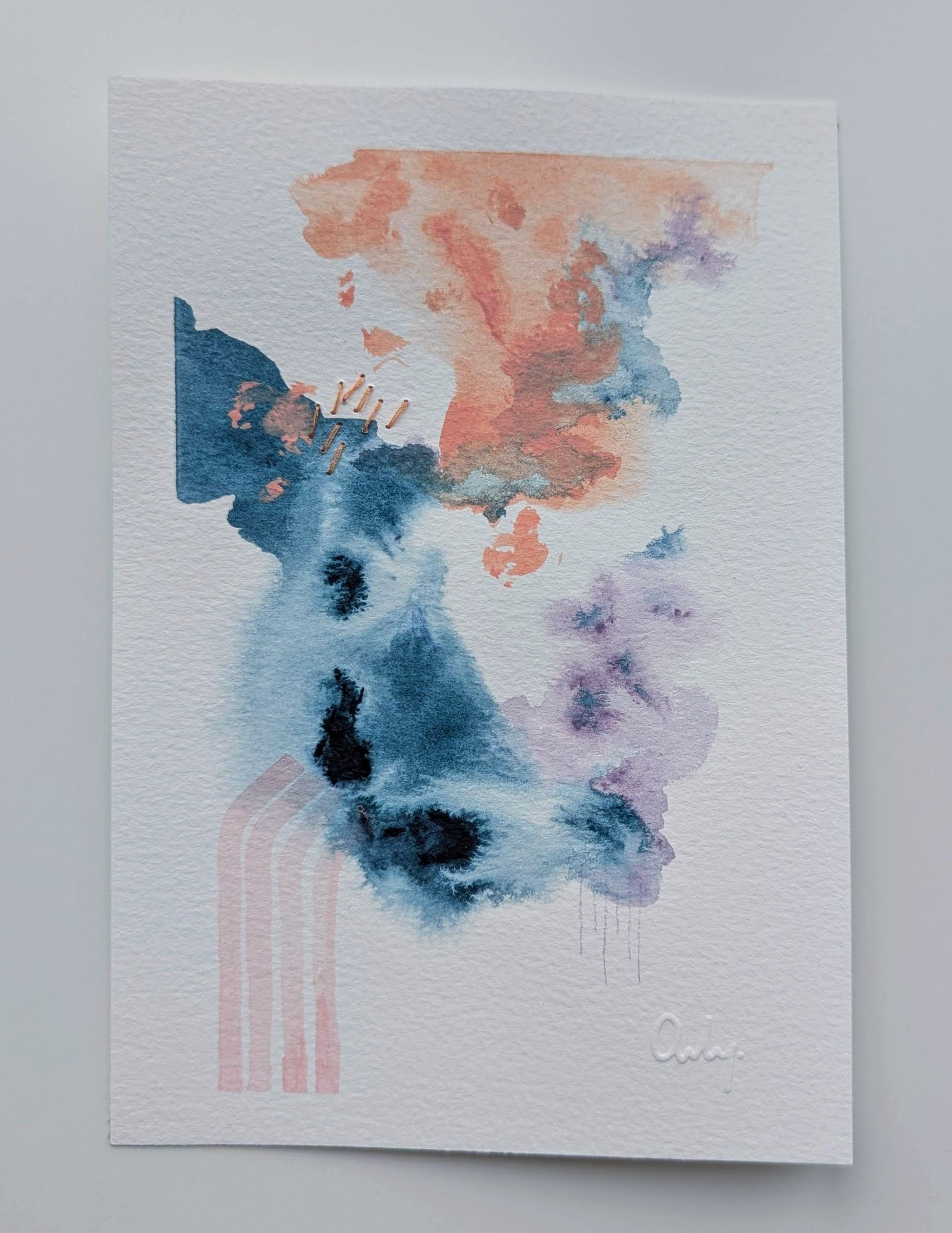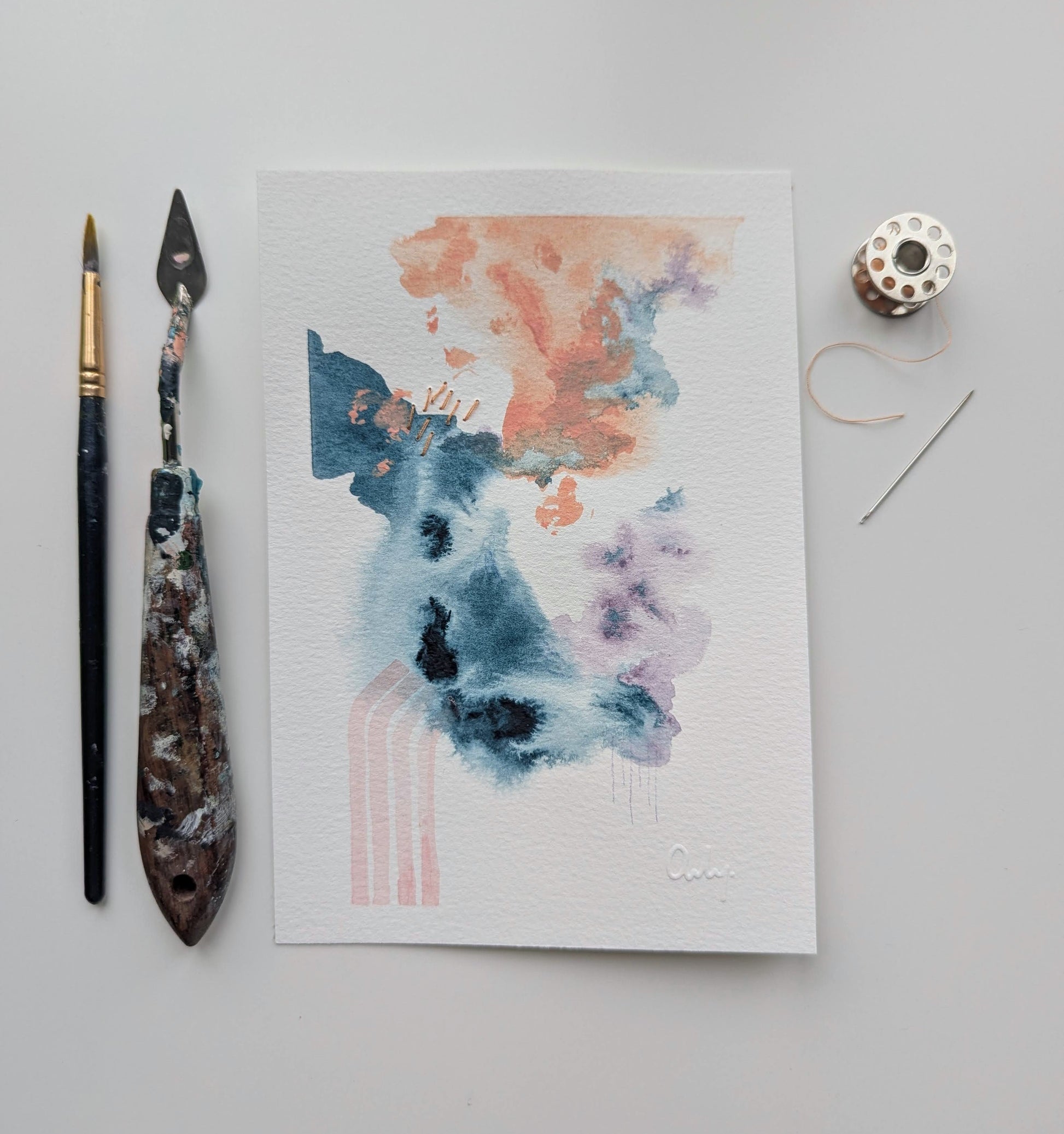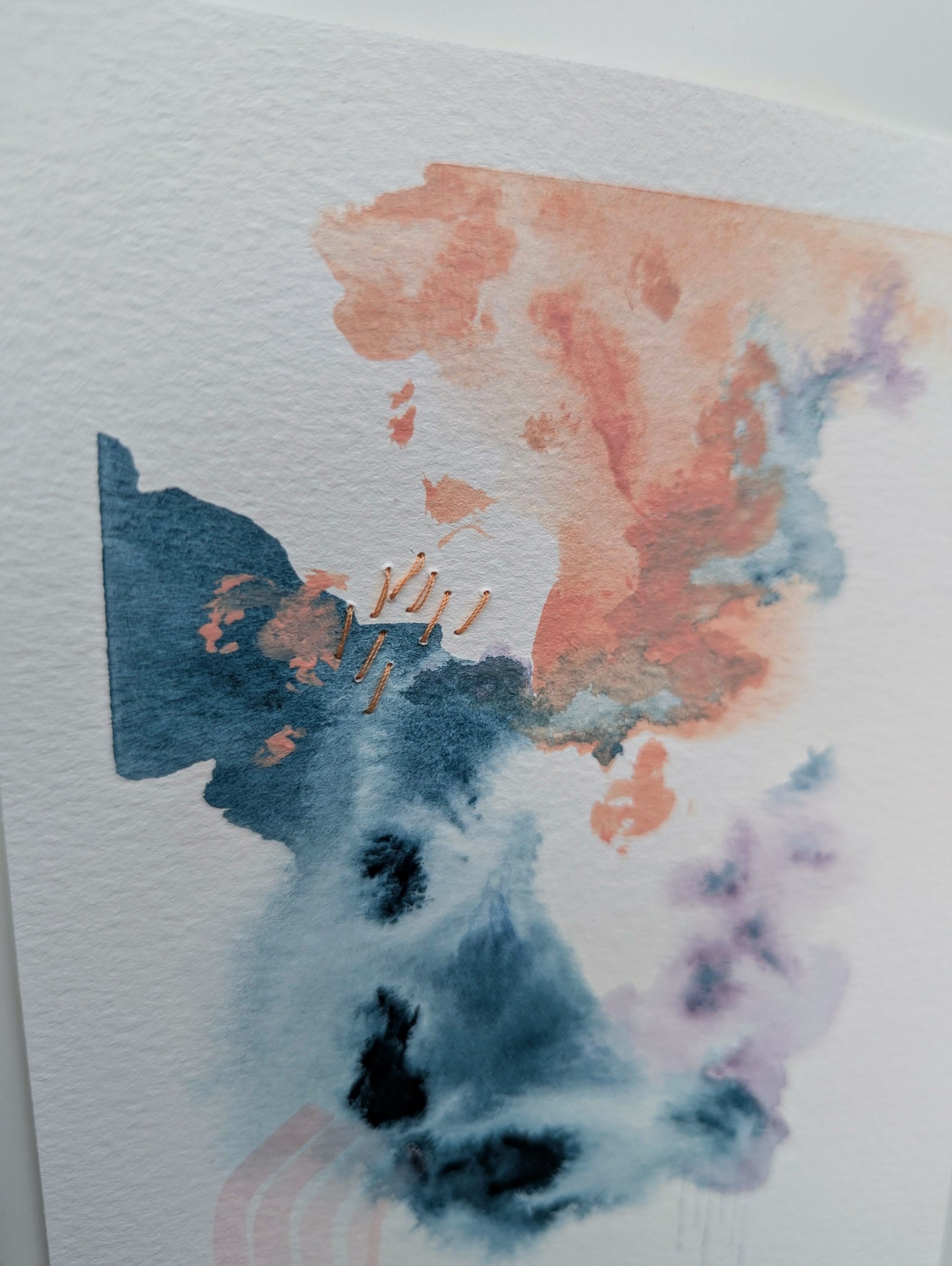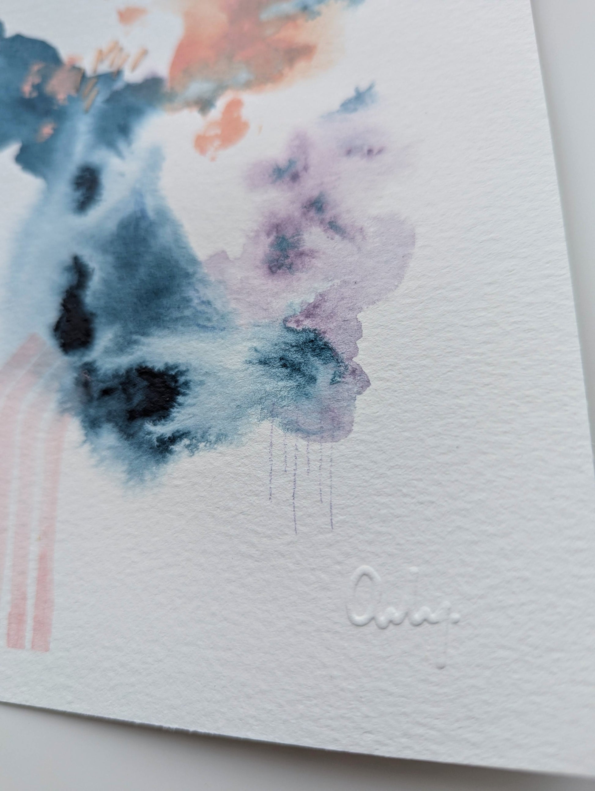 Médium: Peinture, crayon, broderie sur papier 300 mg/m2 pressé à froid (c.-à-d., un papier cartonné de qualité avec une légère texture). Signature par embossage sur papier.
