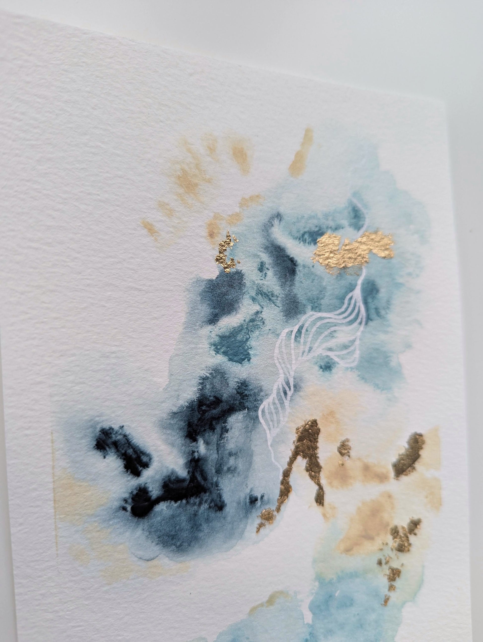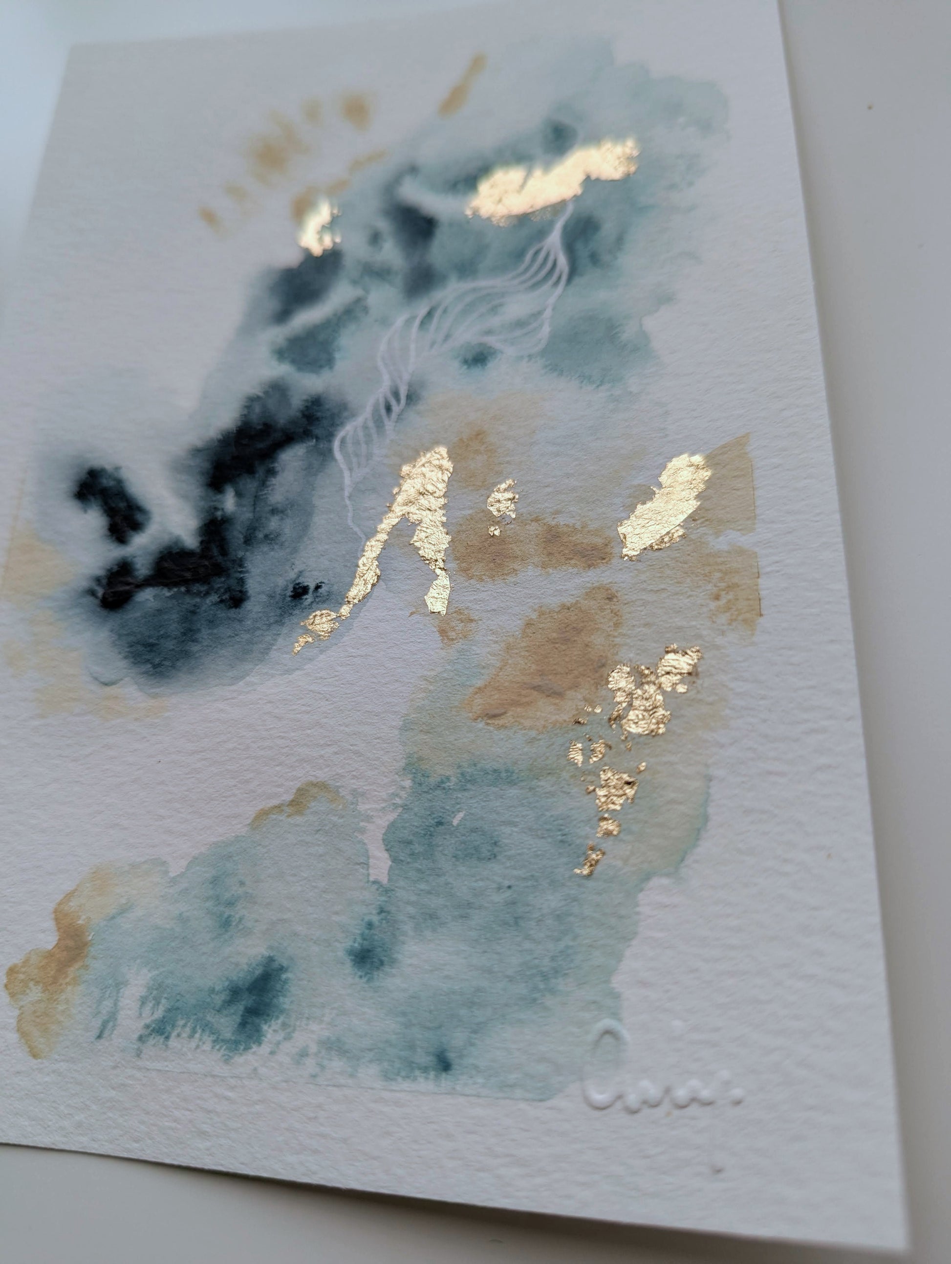Médium: Peinture, crayon et dorure sur papier 300 mg/m2 pressé à froid (c.-à-d., un papier cartonné de qualité avec une légère texture). Signature par embossage sur papier.