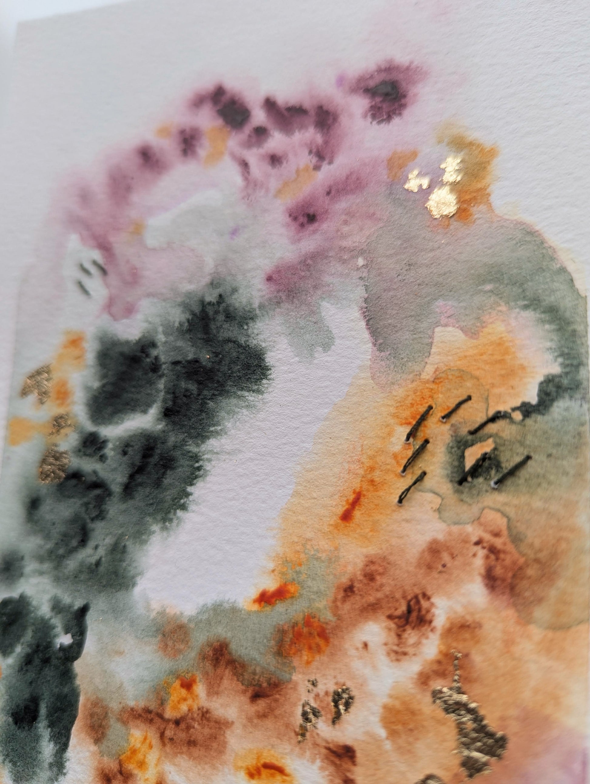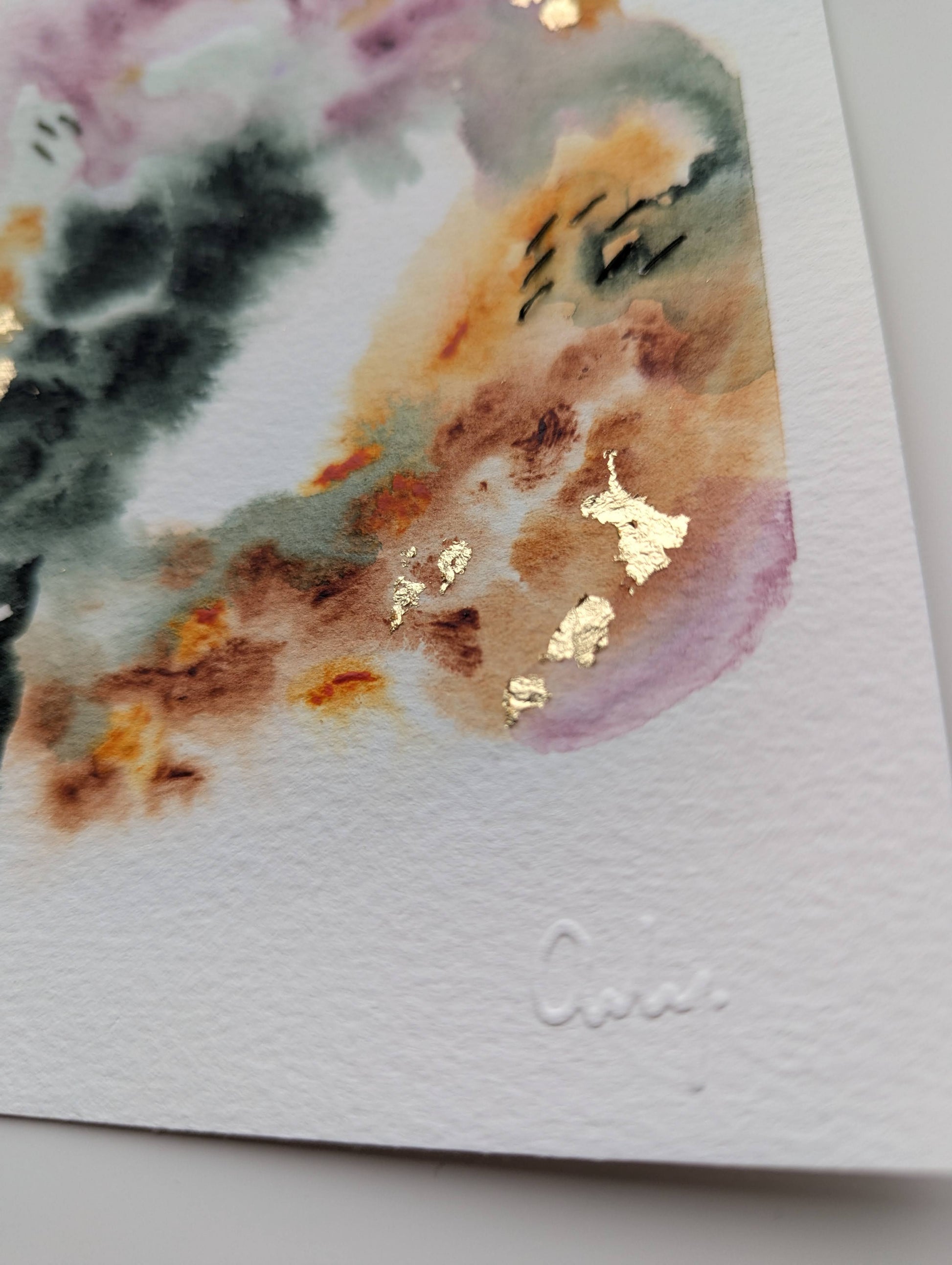 Médium: Peinture, crayon, broderie et dorure sur papier 300 mg/m2 pressé à froid (c.-à-d., un papier cartonné de qualité avec une légère texture). Signature par embossage sur papier.