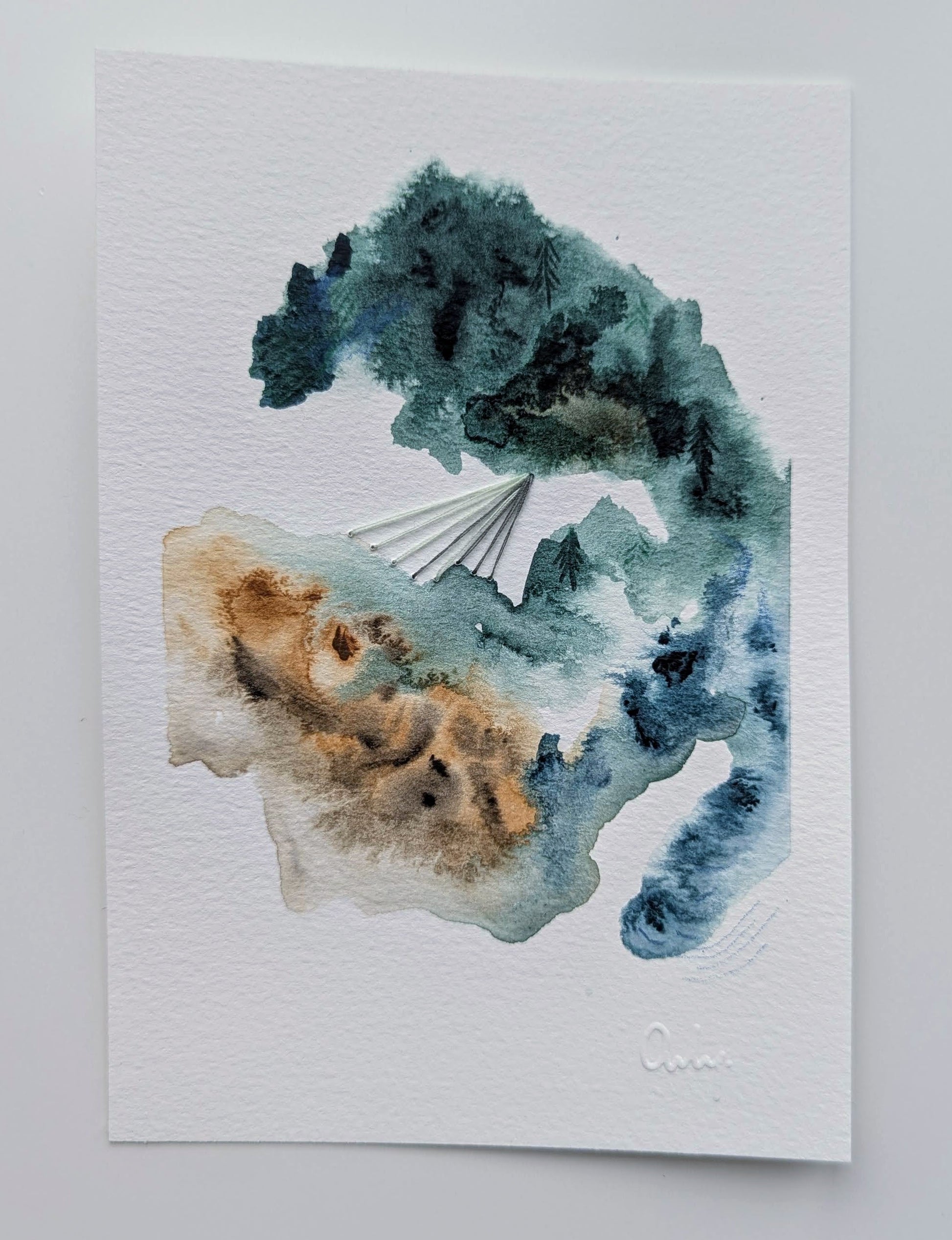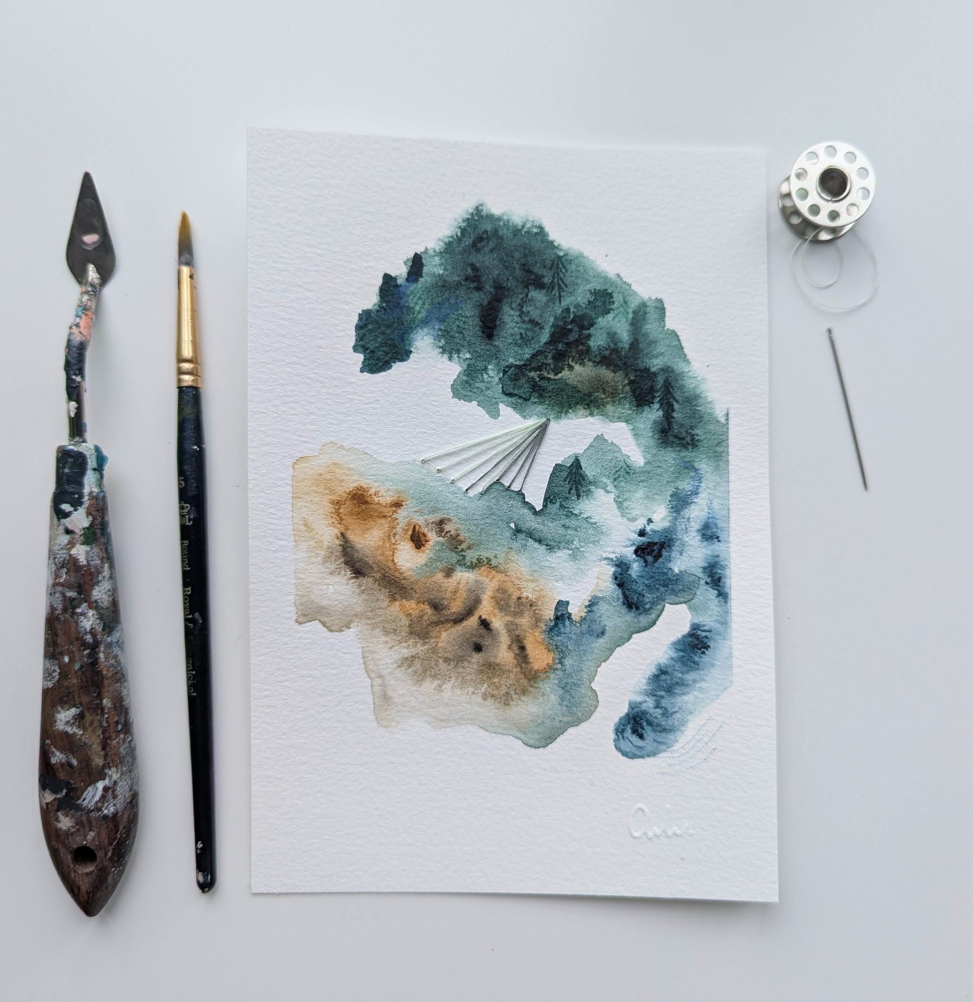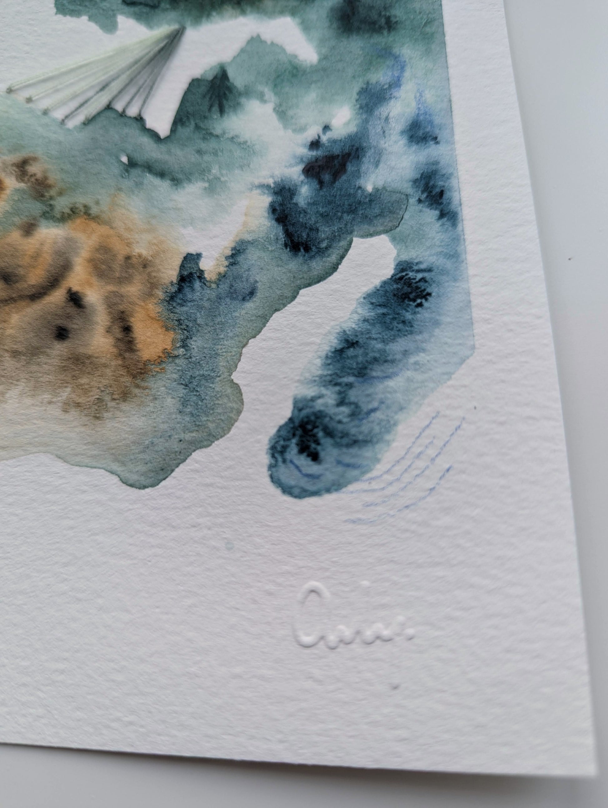 Médium: Peinture, crayon, broderie sur papier 300 mg/m2 pressé à froid (c.-à-d., un papier cartonné de qualité avec une légère texture). Signature par embossage sur papier.
