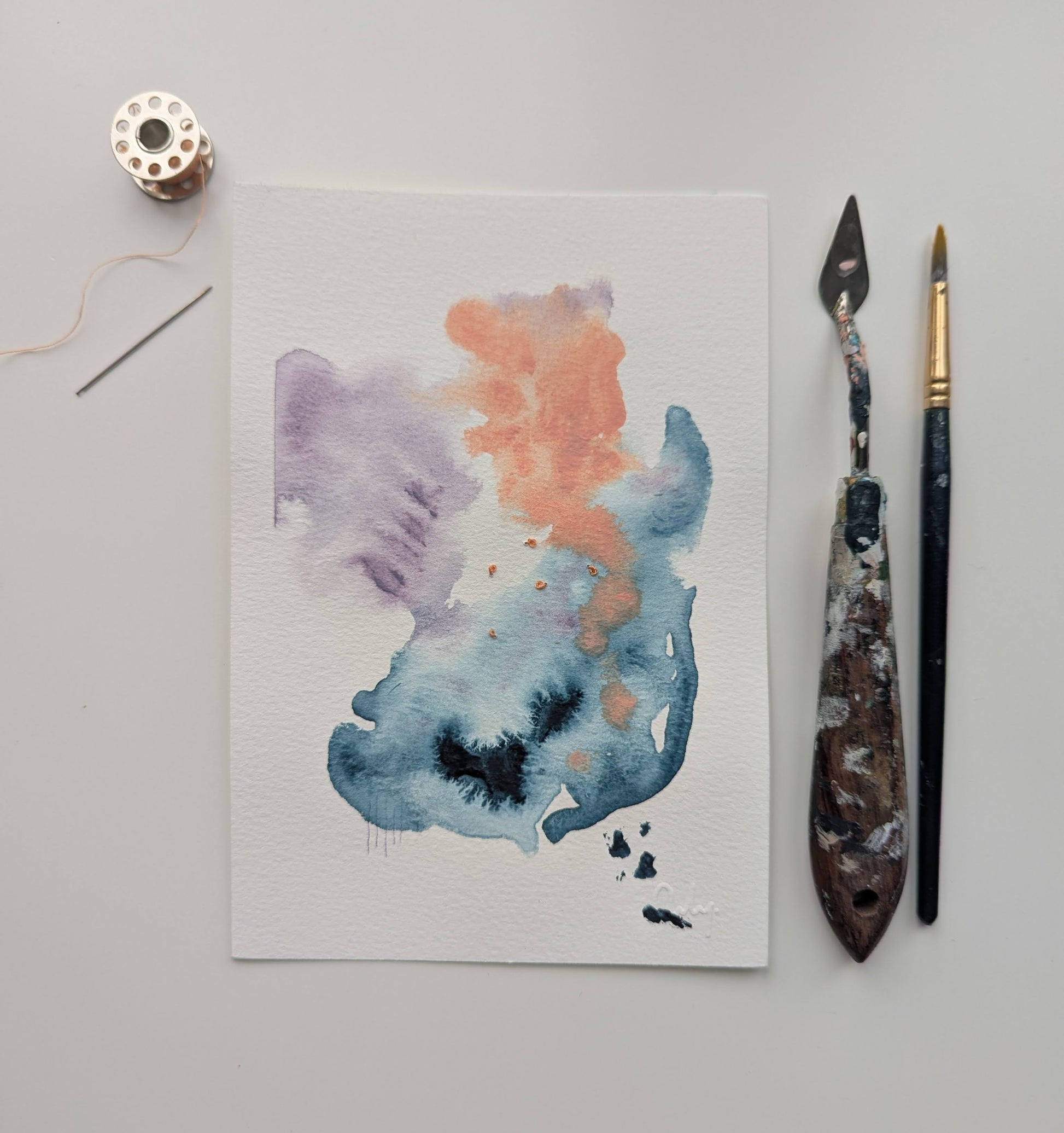 Médium: Peinture, crayon, broderie sur papier 300 mg/m2 pressé à froid (c.-à-d., un papier cartonné de qualité avec une légère texture). Signature par embossage sur papier.