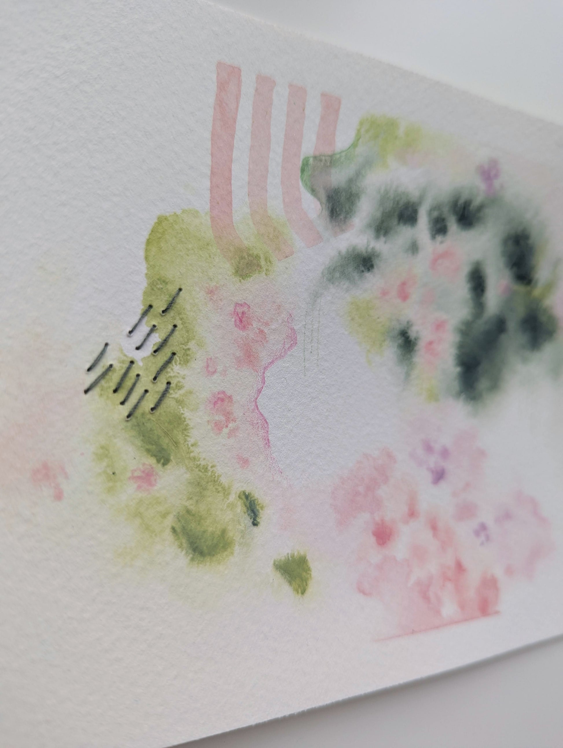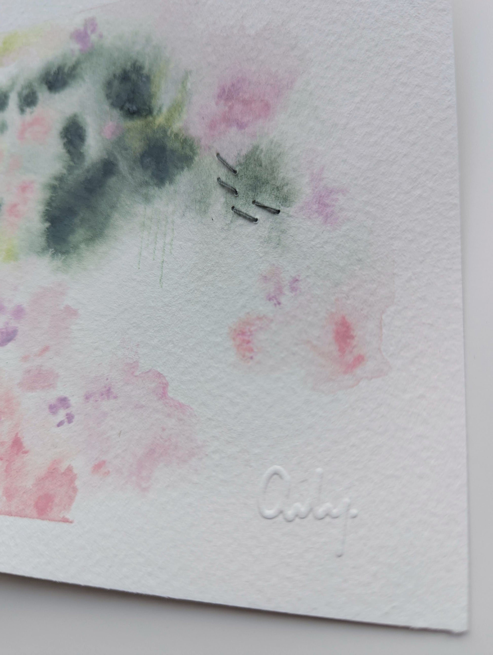 Médium: Peinture, crayon, broderie sur papier 300 mg/m2 pressé à froid (c.-à-d., un papier cartonné de qualité avec une légère texture). Signature par embossage sur papier.